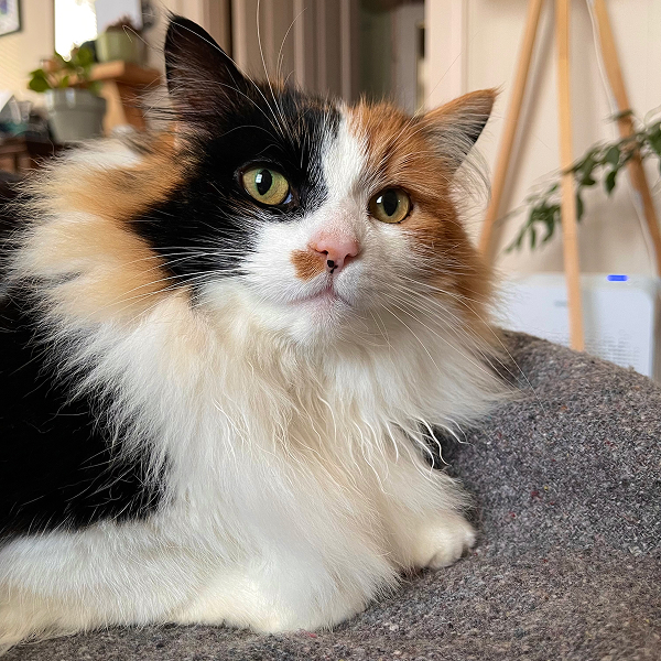 Once a scrappy street-smart scavenger, Iris made a name for herself helping herself to neighborhood cat food (especially from the neighbor’s house—sorry, not sorry). These days, she’s traded the streets for royalty, ruling her home with sass, style, and an insatiable appetite. Iris still acts like every meal is her last and has a talent for cabinet raids and “cozy” naps—often among the Tupperware. Her favorite toys? A silvervine stick she’ll fetch like a dog and a well-loved stuffed carrot. Fiercely independent, boldly affectionate, and blessed with the most expressive eyes in the biz, Iris is snack-driven and queen-approved.
